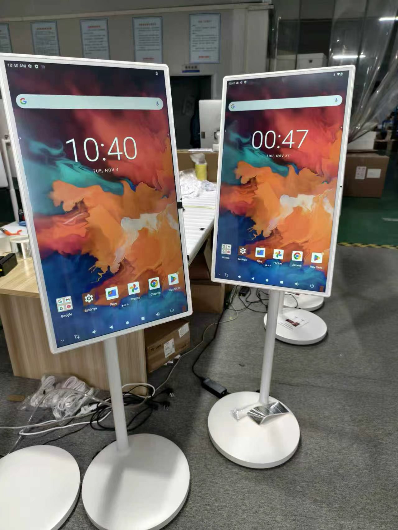 Android-powered portable smart TV with built-in battery, capacitive touch screen, and rolling wheels. Features 4+64GB storage, WiFi & Bluetooth connectivity, and 8MP camera. Ideal for home, kitchen, fitness, and outdoor use.
