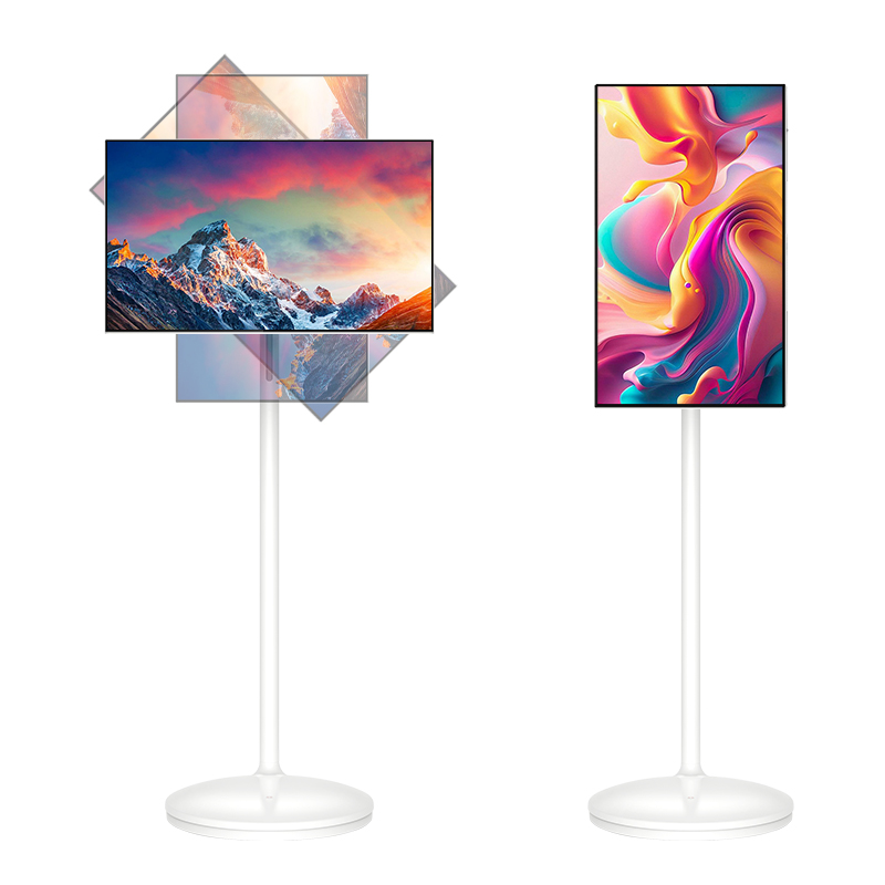 Android-powered portable smart TV with built-in battery, capacitive touch screen, and rolling wheels. Features 4+64GB storage, WiFi & Bluetooth connectivity, and 8MP camera. Ideal for home, kitchen, fitness, and outdoor use.